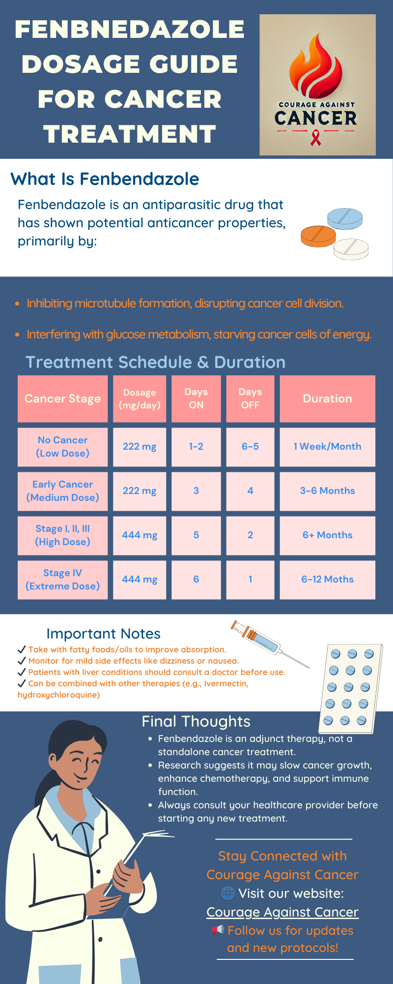 This comprehensive flowchart details the Fenbendazole dosage protocol for cancer treatment. It provides a clear, step-by-step guide for patients and practitioners, including dosing schedules, cycling recommendations, and key synergistic supplements to support the treatment’s efficacy.